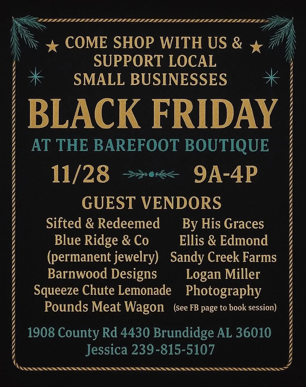 These orders will be picked up at our booth at The Barefoot Boutique’s Black Friday Event. We will be there between 9:00am-2:00pm.